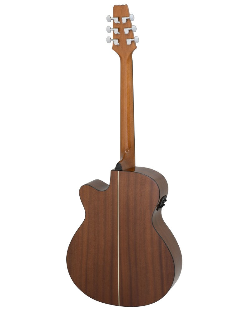 Spruce top with sapele back and side. Available in both gloss and matte finish.