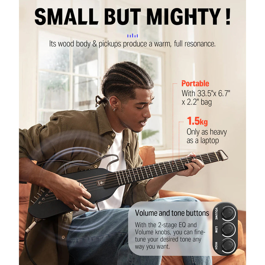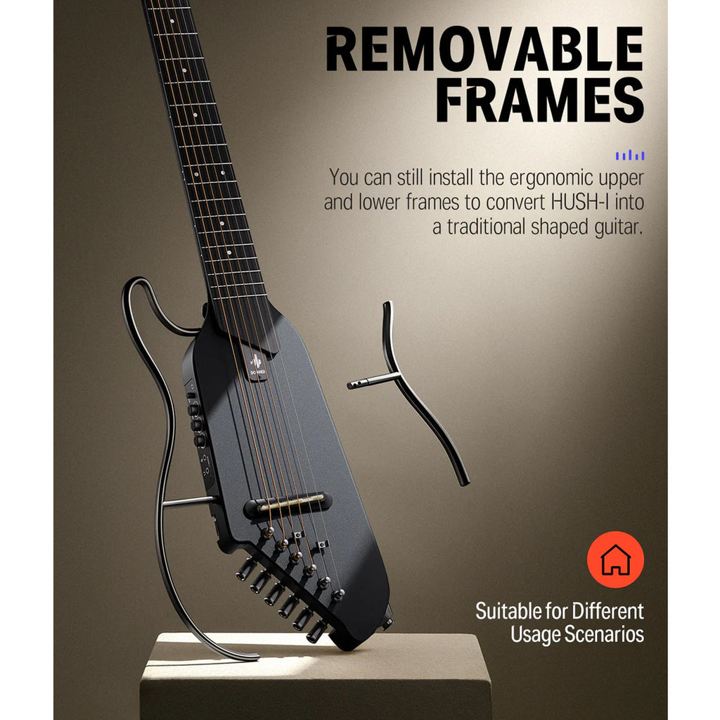 The ultra-compact and lightweight Donner HUSH-I Guitar is the perfect axe for travel and practice. Although being a full-scale guitar, it features a headless and detachable bar-frame design for extreme compaction and quietness with the least amount of wood. The onboard Donner custom-designed piezo pickup and preamp deliver you the ideal tone over the unplugged quietness via headphones and traditional cable output while also giving you full tone control with the “Volume”, “High”, and “Low” Knobs. The onboard “Phase” button also guarantees you stability in live venues. Play beyond the limits.