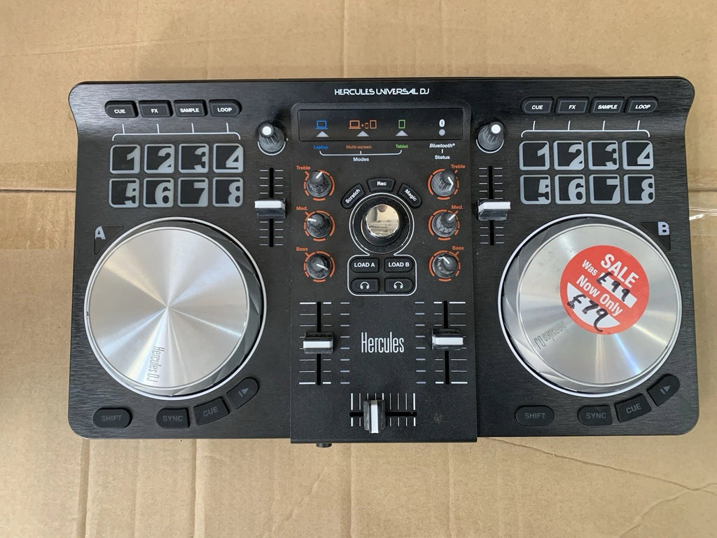 The Hercules Universal DJ Controller is a highly versatile DJ Controller featuring everything you need to get started as a DJ. The affordable price tag and comprehensive range of controls allows you to be as creative as a professional DJ. The dual capacitive jog wheels come complete with an integrated mixer which features a range of transport controls and a built-in 3-band EQ for creating seamless transitions between mixes. Also included are 16 performance pads which can be used for everything from creating cue points and loops to trigger audio samples for added flare. One of the most prominent features is the built-in Bluetooth wireless technology that eliminates the need for tedious cables. The high-speed Bluetooth connection allows you to connect your laptop/computer wirelessly, allowing you to access your full music collection without the need for cables.