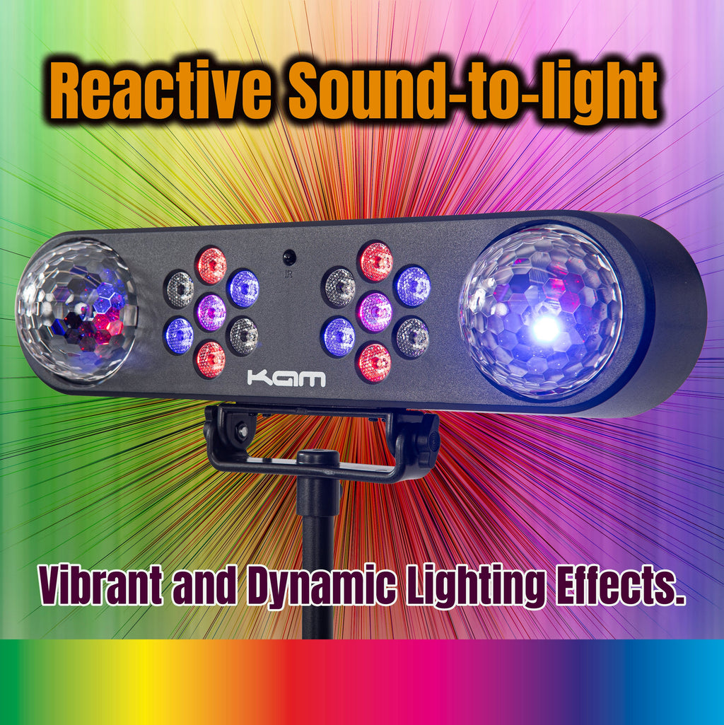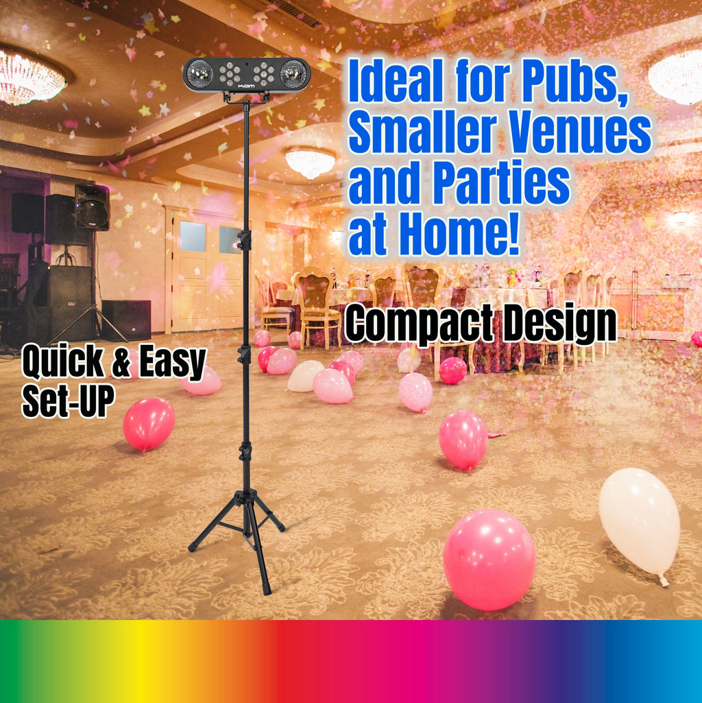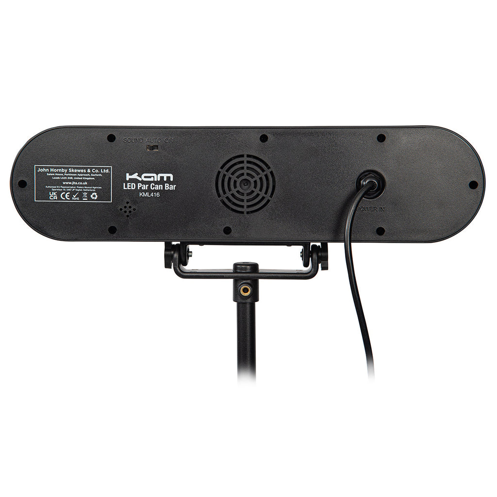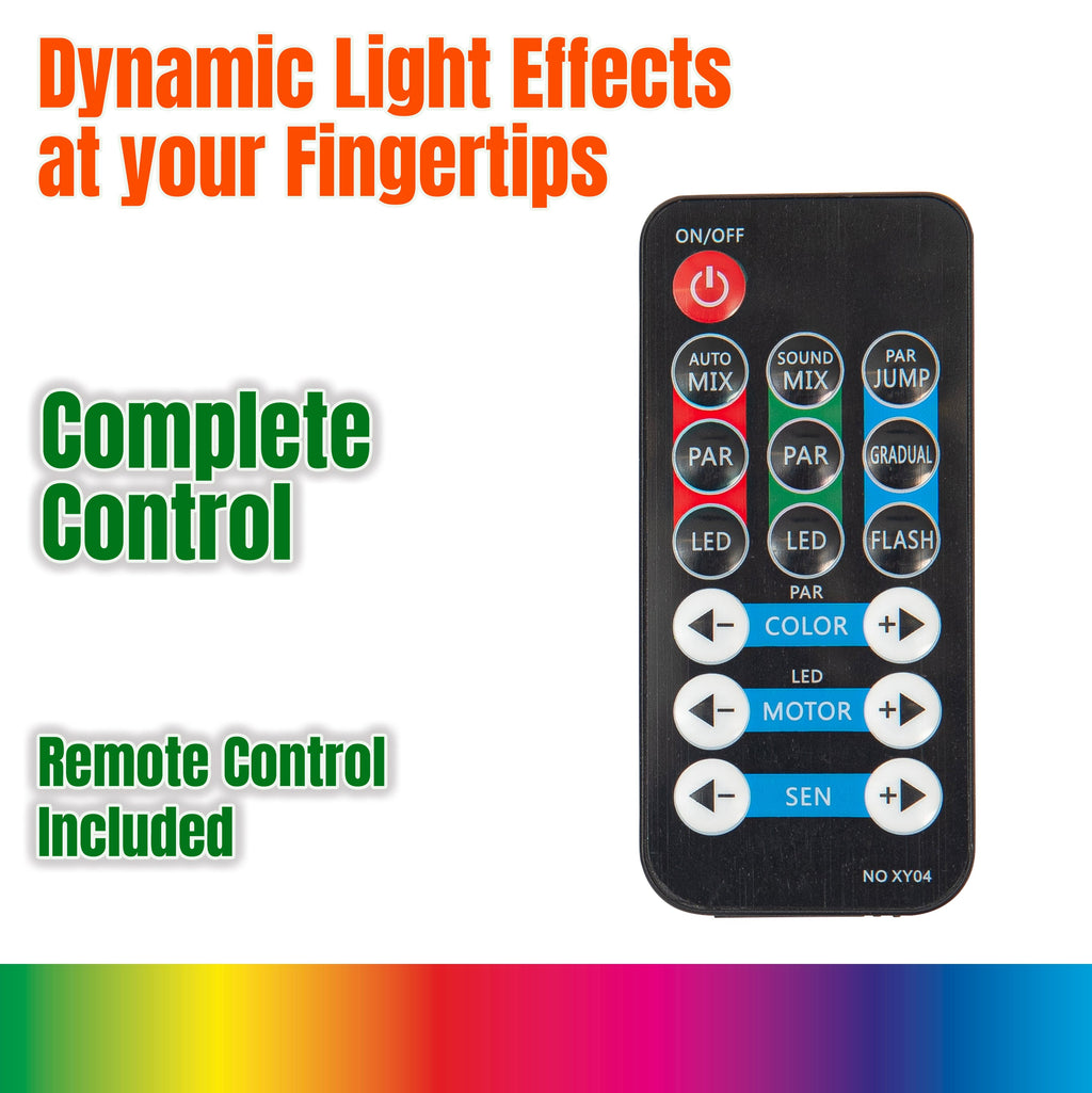 Sound-to-light, static or manual modes, presets, and Menu/Up/Down/Enter controls can be selected via the easy-read LED panels on the T-bars themselves, or via the included wireless remote control.